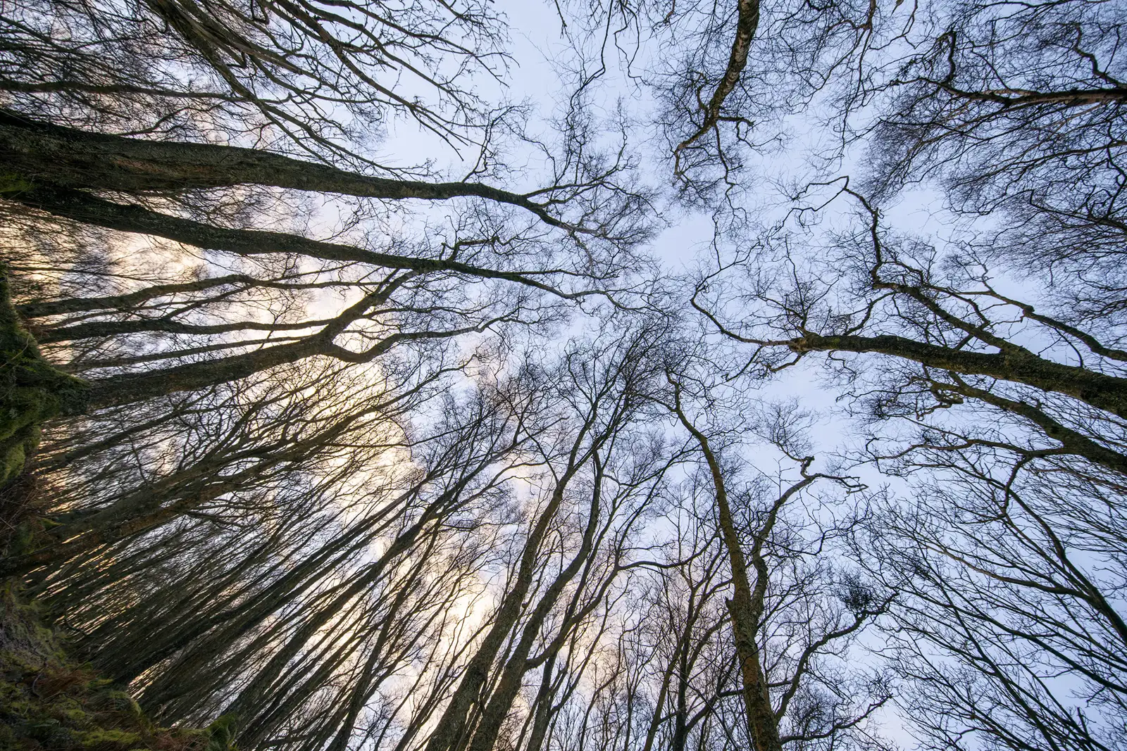 Looking up at a canopy of trees with twisted branches and abundant yellow leaves, the sunlight filters through, creating a warm and glowing atmosphere. The intricate network of branches adds a sense of depth and complexity.